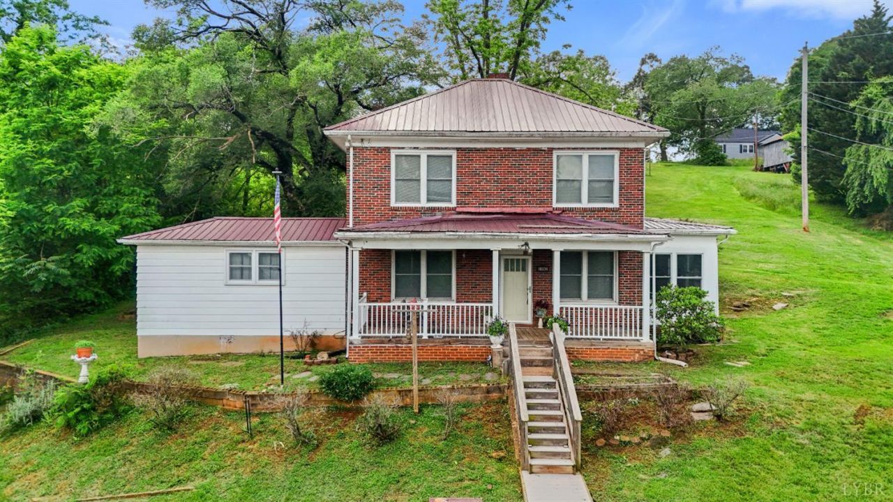 Perched on a hill overlooking Big Island, this classic 2-story brick charmer offers seasonal James River views with the Blue Ridge mountains as a stunning backdrop. A rocking chair porch welcomes you in. Inside: tall ceilings, hardwoods, timeless millwork, spacious living, dining, kitchen, adorable sunroom, and main-level primary with en-suite. Upstairs: 2 bedrooms, full bath, and office or 4th bedroom (no closet). Zoned C-2 with underground parking/storage. Ideal as a lovely primary home or short/mid-term rental for traveling Georgia Pacific Mill contractors or traveling nurses, convenient to 4 hospitals within 35 miles or less. Newer metal roof, HVAC, water heater, 200-amp service, and sump pump. Minutes to boat ramps, Parkway, Sedalia Center and 12 miles to Boonsboro Food Lion and 20 miles to the Town of Bedford. Right of way to the property from Sunset Hill for easy access to the property.
