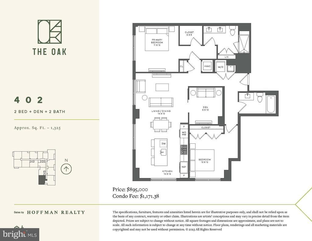 Schedule an appointment to tour The Oak, now over 55% sold and "move-in" ready. Unit 402 is a 2BR with den /2BA corner unit with a SW exposure and includes 1 parking space. Unit 402 has an open floorplan, two-tone European inspired frameless kitchen cabinetry, matte black hardware and fixtures, quartz countertops, tile kitchen backsplashes, kitchen islands, ENERGY STAR® Bosch kitchen appliances, full-size GE washer/dryers, LED light fixtures, Porcelanosa wide-plank wood-style flooring, high ceilings and expansive windows. Building Amenities Include: 5,000 SF outdoor terrace with gas grills, bar seating, dining and lawn, cozy penthouse terrace with dining and lounge seating, residents’ lounge with fireplace, lounge and communal dining, fitness center with cardio equipment and free weights, 24-hour front desk, secure bike storage, car detailing station, and pet washing station.
